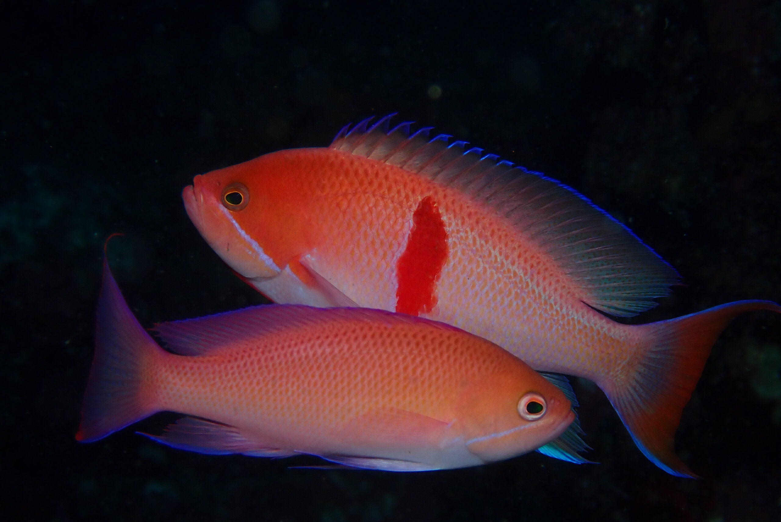 手前のメスの紫の尾びれも、オスの婚姻色も見とれてしまいますね。